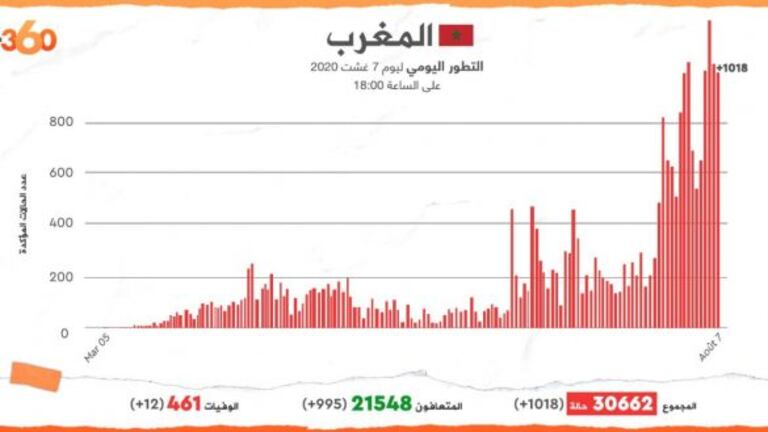 وأوضح منسق المركز الوطني لعمليات طوارئ الصحة العامة بوزارة الصحة، معاد لمرابط، في تصريح صحافي، أن الحصيلة الجديدة رفعت العدد الإجمالي لحالات الإصابة المؤكدة بالمملكة إلى 30 ألف و662 حالة منذ الإعلان عن أول حالة في 2 مارس الماضي، ومجموع حالات الشفاء التام إلى 21 ألفا و548 حالة بنسبة تعاف تناهز 70 في المائة، فيما ارتفع عدد الوفيات إلى 461 حالة.