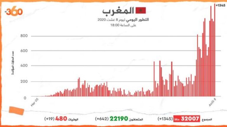 وأوضح منسق المركز الوطني لعمليات طوارئ الصحة العامة بوزارة الصحة، معاد لمرابط، في تصريح صحافي، أن الحصيلة الجديدة رفعت العدد الإجمالي لحالات الإصابة المؤكدة بالمملكة إلى 32 ألف و7 حالات منذ الإعلان عن أول حالة في 2 مارس الماضي، ومجموع حالات الشفاء التام إلى 22 ألفا و 190 حالة بنسبة تعاف تناهز 69,3 في المائة، فيما ارتفع عدد الوفيات إلى 480 حالة.