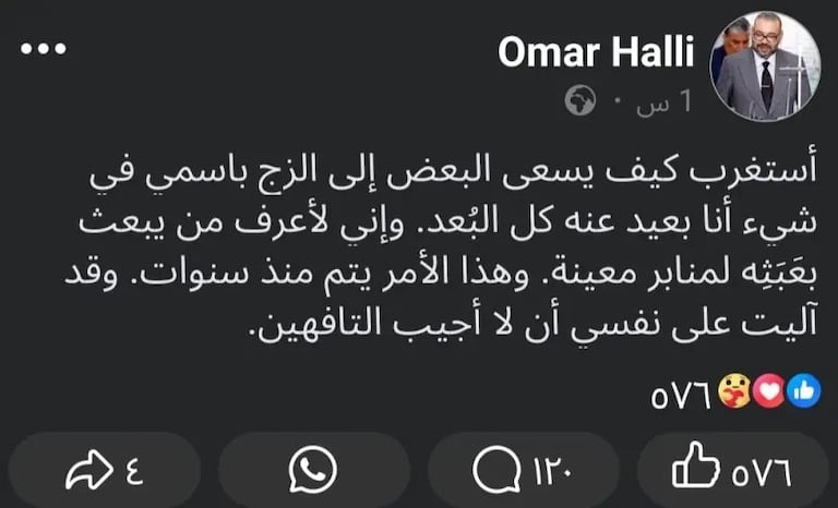 عمر حلي، الرئيس السابق لجامعة ابن زهر ومستشار المدير العام للإيسيسكو لاتحاد جامعات العالم الإسلامي حاليا، أحد الأسماء التي تبرأت مما هو متداول، قائلا، في تدوينة له على صفحته الخاصة على فيسبوك: «أستغرب كيف يسعى البعض إلى الزج باسمي في شيء أنا بعيد عنه كل البُعد، وإني لأعرف من يبعث بعَبَثِه لمنابر معينة، وهذا الأمر يتم منذ سنوات وقد آليت على نفسي أن لا أجيب التافهين»، وذلك في إشارة إلى جهات يعتبرها «تسعى إلى النيل من سمعته».