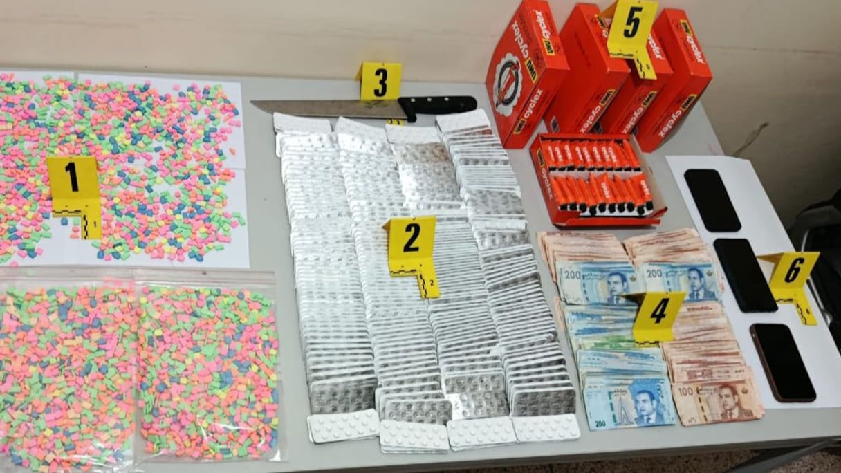 وقد مكنت الأبحاث والتحريات المتواصلة في هذه القضية من توقيف شخص ثالث يشتبه في ارتباطه بهذا النشاط الإجرامي، وذلك قبل أن تقود عملية التفتيش المنجزة بداخل منزل يستغله بالمنطقة القروية « القليعة » إلى العثور بحوزته على 4590 قرصا مهلوسا إضافيا من نوع « إكستازي »، فضلا عن مبلغ مالي آخر من متحصلات ارتكاب هذه الأفعال الإجرامية.