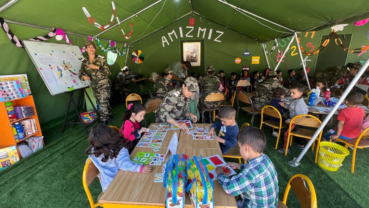 وداخل المخيم الذي وضعته القوات المسلحة الملكية بمنطقة أمزميز لإيواء العائلات المتضررة جراء الزلزال تم تخصيص خيمة خاصة بالأطفال تقدم عددا من الأنشطة الترفيهية كالأناشيد وورشات الرسم والغناء والألعاب التربوية. وتشرف على تقديم الأنشطة جنديات بالقوات المسلحة الملكية واللواتي يساهمن بأناملهم ودعمهن في التخفيف من وقع تداعيات الزلزال على نفسية أطفال المخيم.