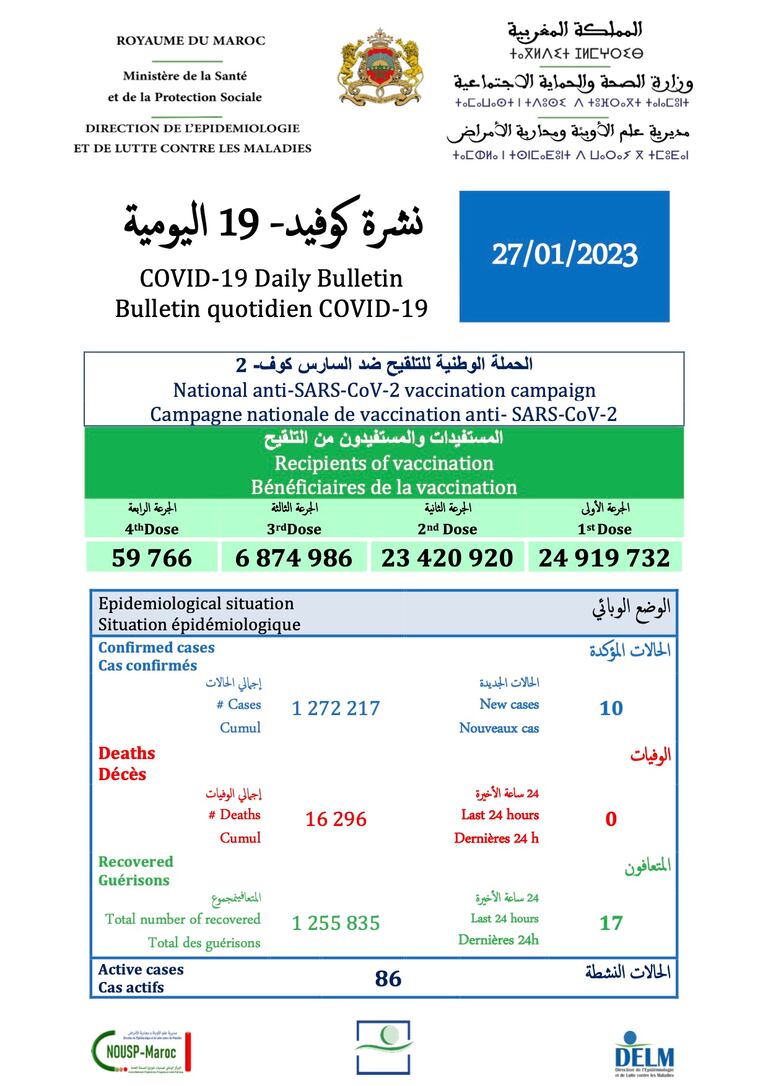 وفي نفس الصدد، أضاف المصدر ذاته أن عدد المستفيدين من الجرعة الأولى من اللقاح بلغ 24.919.732 شخصا، وبلغ عدد المستفيدين من الجرعة الثانية 23.420.920 شخصا، بينما بلغ عدد المستفيدين من الجرعة الثالثة 6.873.986 شخصا، ثم بلغ عدد المستفيدين من الجرعة الرابعة 59.766 شخصا.
