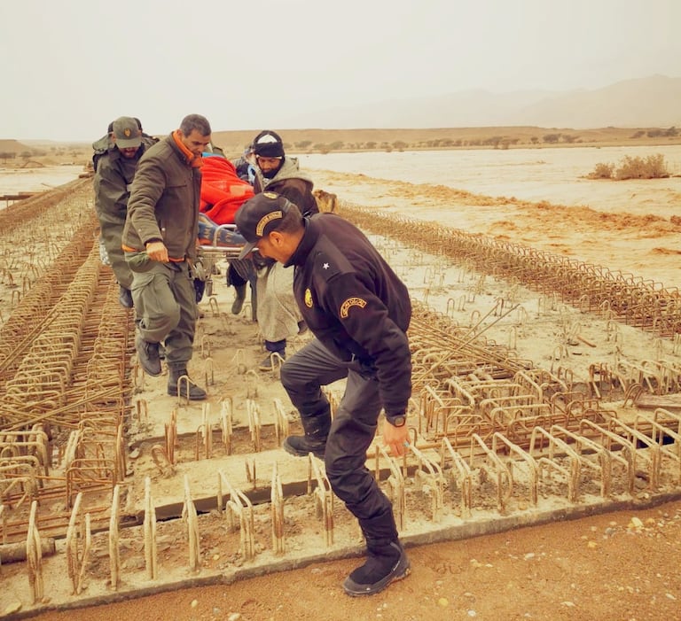 في تفاصيل، تمت الإستعانة بالسلطة المحلية وأعوانها عقب محاصرة المياه للسيدتين وأسرهم بالمنطقة، حيث تم نقلهم بواسطة نقالة يدوية للإسعاف عبر قنطرة في طور الإنجاز وذلك على مستوى الطريق الوطنية رقم 17 بين أيت وابلي واقا على وادي اقا، حيث تتواصل بها أيضا أشغال ازالة الركام والوحل.
