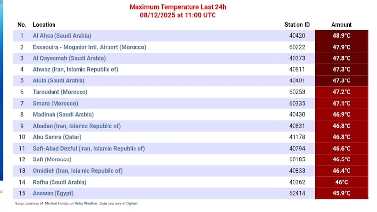 وبحسب الموقع المذكور، احتلت مدينة الصويرة المرتبة الثانية عالميًا لأكثر المدن حرارة، بدرجة حرارة بلغت 47.9، متقدمة على العديد من المناطق الصحراوية المعروفة بحرارتها الشديدة، ولم تتجاوزها إلا واحة الأحساء في السعودية التي سجلت 48.9 درجة.