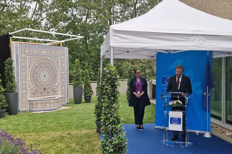 وأكدت أن هذه النافورة (3 أمتار على 2,7 متر) تجسد ثراء ثقافة وفن المغرب، البلد الإسلامي الذي يسوده التعايش، كما ترمز إلى قيم الديمقراطية واحترام الحقوق الأساسية وكرامة الإنسان، التي تتقاسمها المملكة مع مجلس أوروبا وجمعيته البرلمانية.