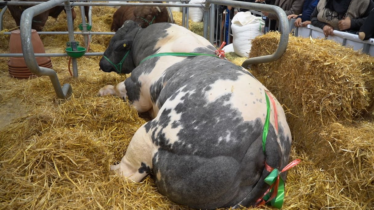 وعلى بعد خطوات قليلة، تبدو بقرة « بييمونتيسي » هادئة ومهيبة في ذات الآن. جسدها القوي ونظرتها الهادئة يأسران الجمهور الذي يقترب بحذر، ويحترم الهدوء الذي تفرضه هذه البقرة الضخمة. أصلها من منطقة « بيمونت » في إيطاليا، وهي معروفة أيضا بنمطها العضلي المميز. وعلى غرار البقرة البلجيكية الهجينة ذات اللون الأبيض الأزرق، تتميز بإنتاجية عالية من اللحوم، وذلك بفضل عضلاتها الكبيرة.