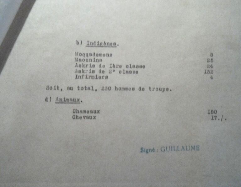 وتذكر الوثيقة مصطلحات من قاموس المخزن التقليدي: قايد طابور، قايد المائة، عسكري، مقدم، معين (مساعد). وتكشف هذه الأسماء عن استعارة حقيقية من الهياكل التقليدية للجيش المغربي، مما يدل على النفوذ المستمر للسلطة الشريفية حتى داخل الإدارة الاستعمارية.