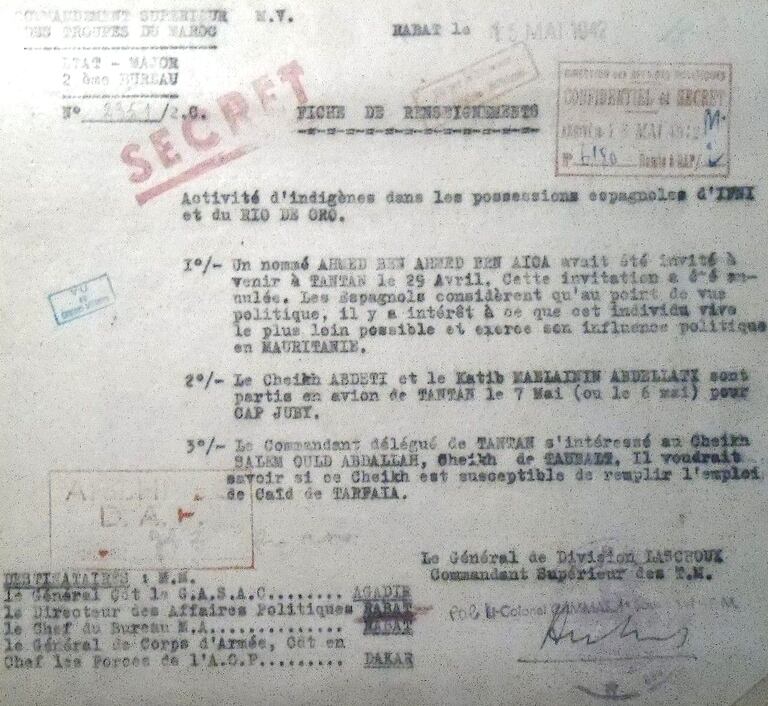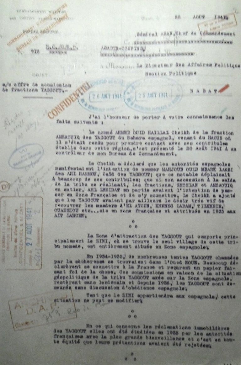 من بين الوثائق المحفوظة في داكار، يبرز تقرير الكابتن سان بون لعام 1938، المخصص لسكان الحدود الصحراوية المغربية، كوثيقة أساسية. بصفته ضابطا فرنسيا عارفا بالجغرافيا البشرية وبالواقع القبلي، رسم سان بون صورة دقيقة لعلاقات الولاء، ودوائر القيادة، وآليات التكامل القبلي التي ربطت الجنوب بشكل دائم بمركز السلطة الشريفية. وكتب قائلا: «على هامش هذه الأحداث التاريخية الكبرى (من فعل المرابطين والسعديين والعلويين)، نلاحظ زحفا شماليا دائما لجميع قبائل الصحراء». («سكان حدود المغرب الصحراوي»، الأرشيف الوطني لأقاليم ما وراء البحار، إكس أون بروفانس، مجموعات خاصة، تحت رقم 10APOM/743.