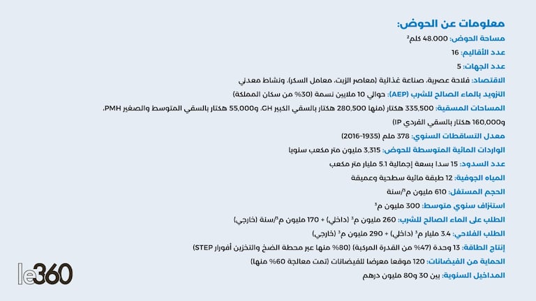 ويعتمد الحوض على بنية مائية مهمة، فإلى جانب السدود 15، هناك 12 طبقة مائية جوفية يتم استغلالها بحجم يصل إلى 610 مليون متر مكعب سنويا، رغم تسجيل استنزاف سنوي يناهز 300 مليون متر مكعب.
