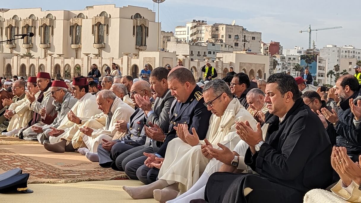 ورفع المصلون على طول الشارع الممتد من مسجد محمد الخامس في اتجاه رأس المصلى، أكف التضرع إلى الله ليجنب البلاد شح المطر، إحياء لسنة النبي المصطفى كلما قل المطر واشتدت الحاجة إليه.