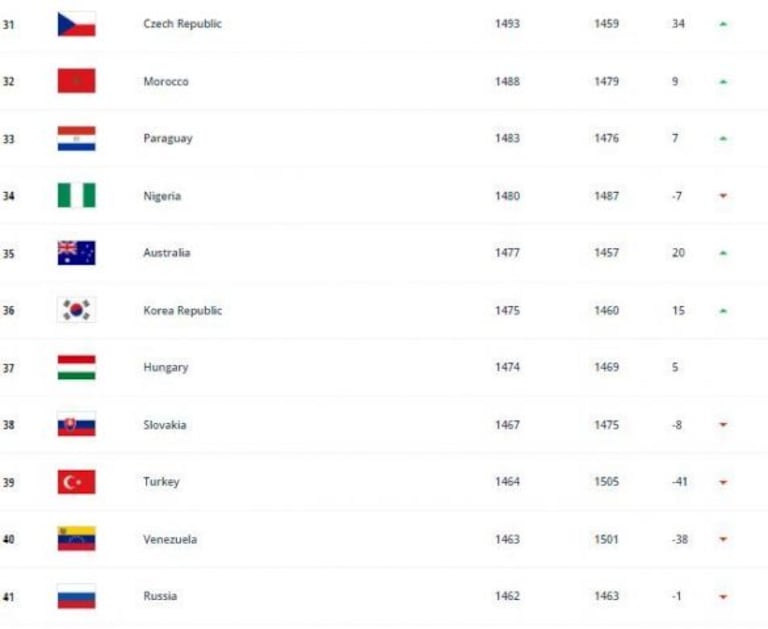 وارتقى "الأسود" إلى المركز الـ32 عالميا برصيد 1488 نقطة، متقدمين بـ9 مراكز كاملة في ترتيب الفيفا، وهي سابقة لم يشهدها المنتخب الوطني منذ سنوات عديدة.