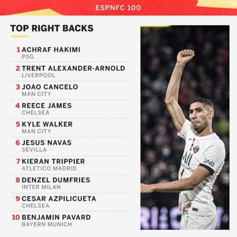 ويتألق حكيمي مرة أخرى هذا الموسم في مركزه وهذه المرة بقميص فريق باريس سان جيرمان الفرنسي، قادما من إنتر ميلان الإيطالي.