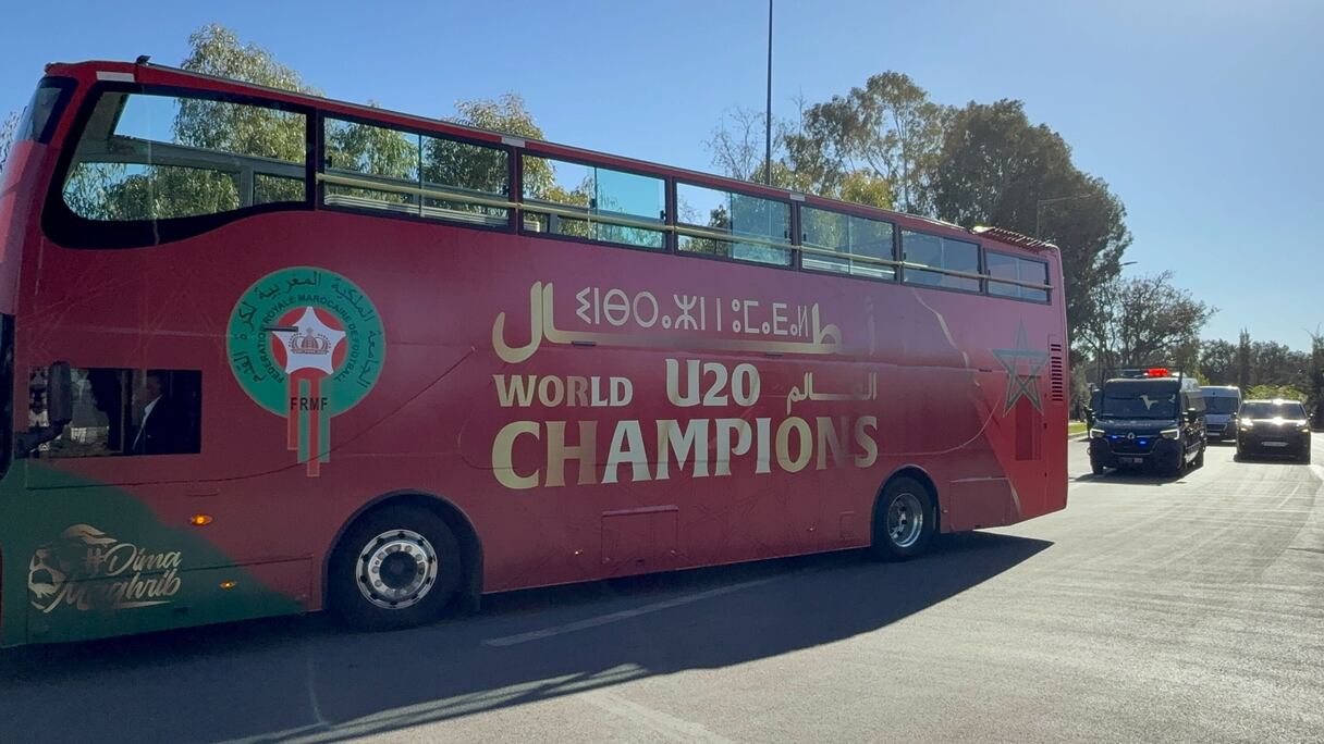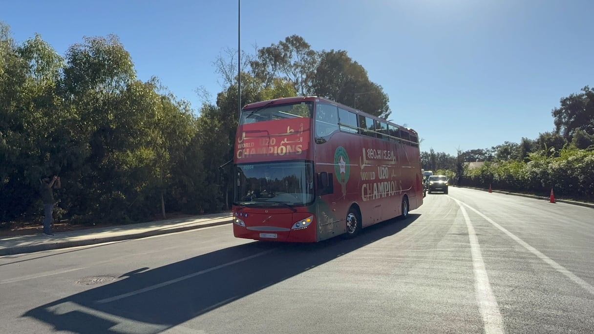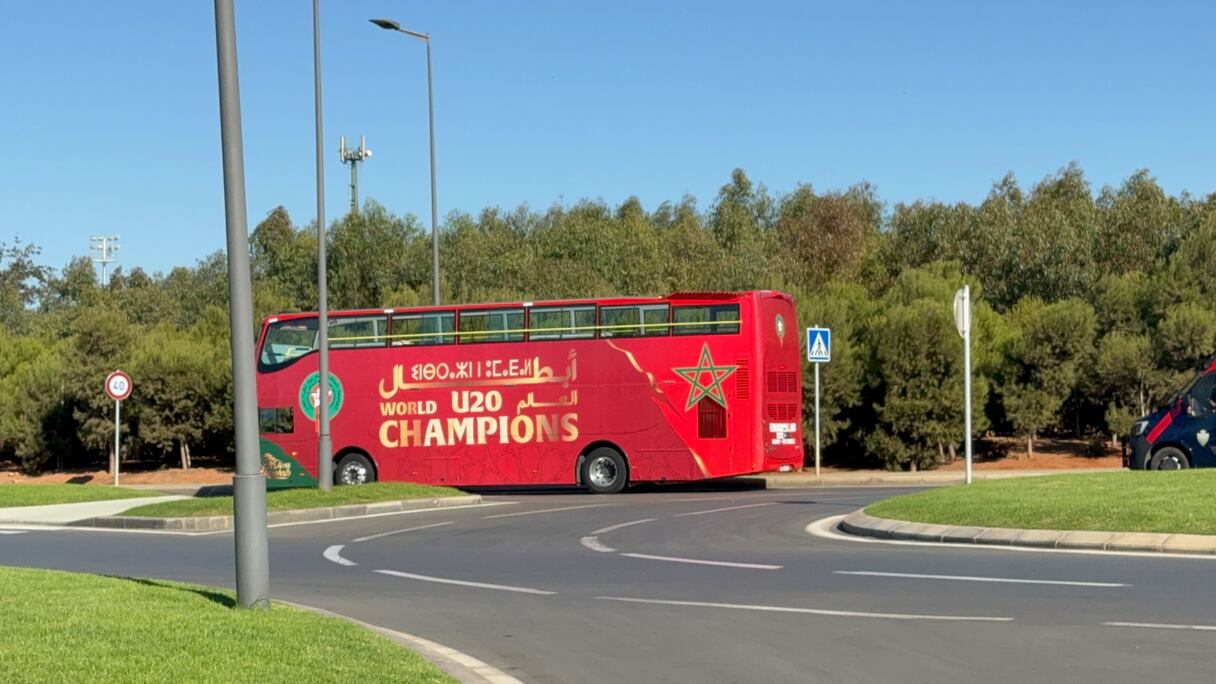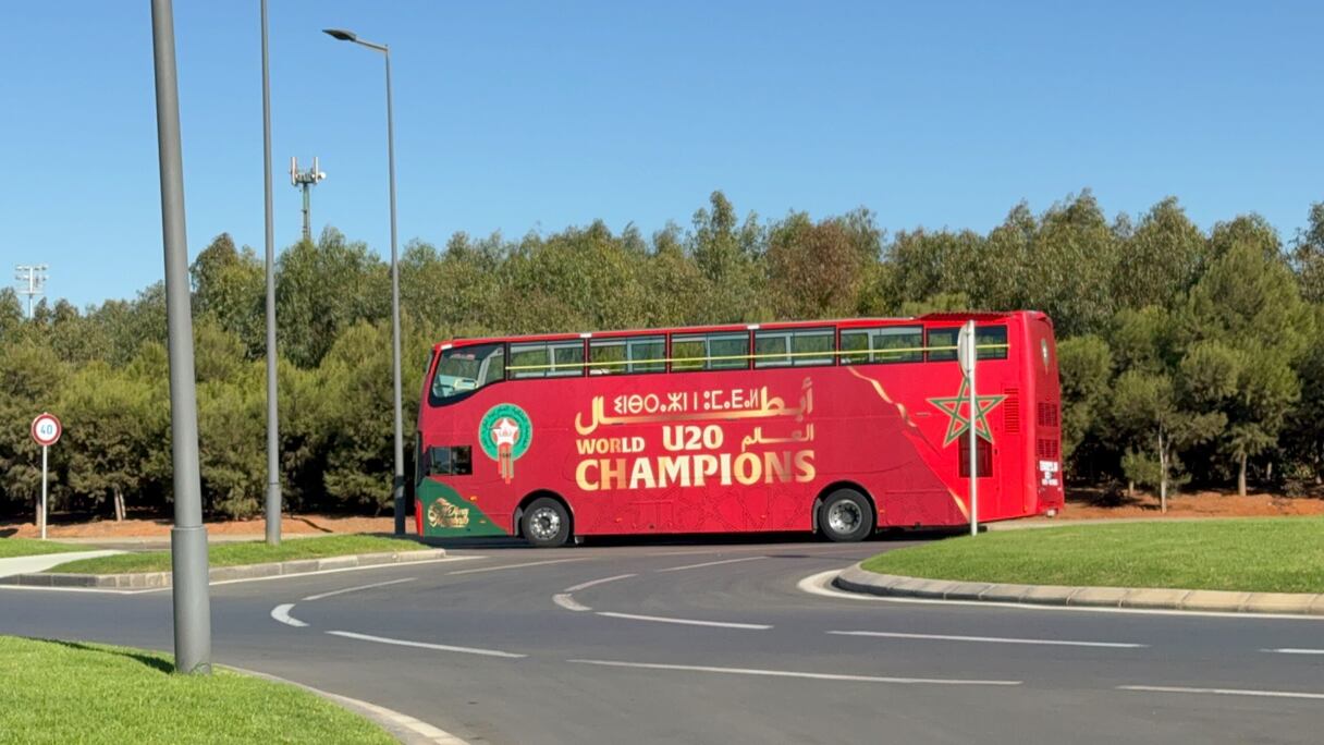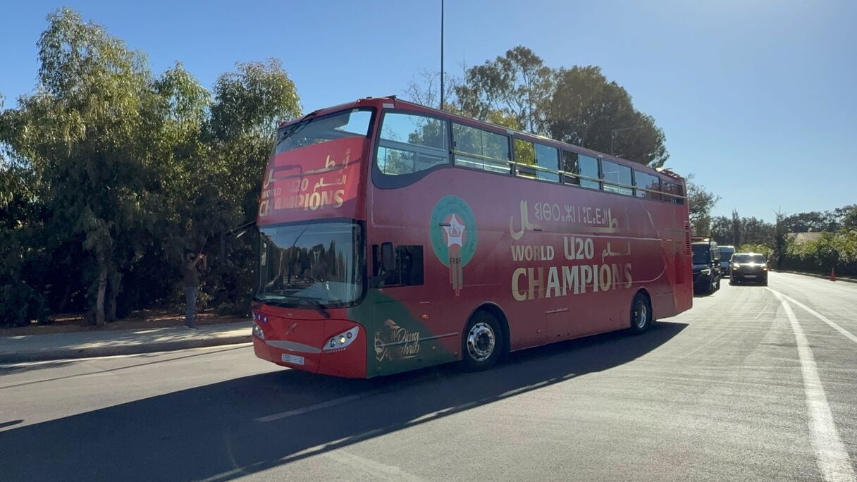 الحافلة التي سيحتفل على متنها لاعبو المنتخب المغربي لأقل من 20 سنة مع الجماهير المتوافدة على وسط مدينة الرباط: