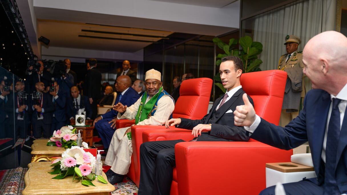 عقب ذلك، التحق ولي العهد بالمنصة الملكية لمتابعة مجريات المباراة التي انتهت بفوز المنتخب المغربي بهدفين لصفر.